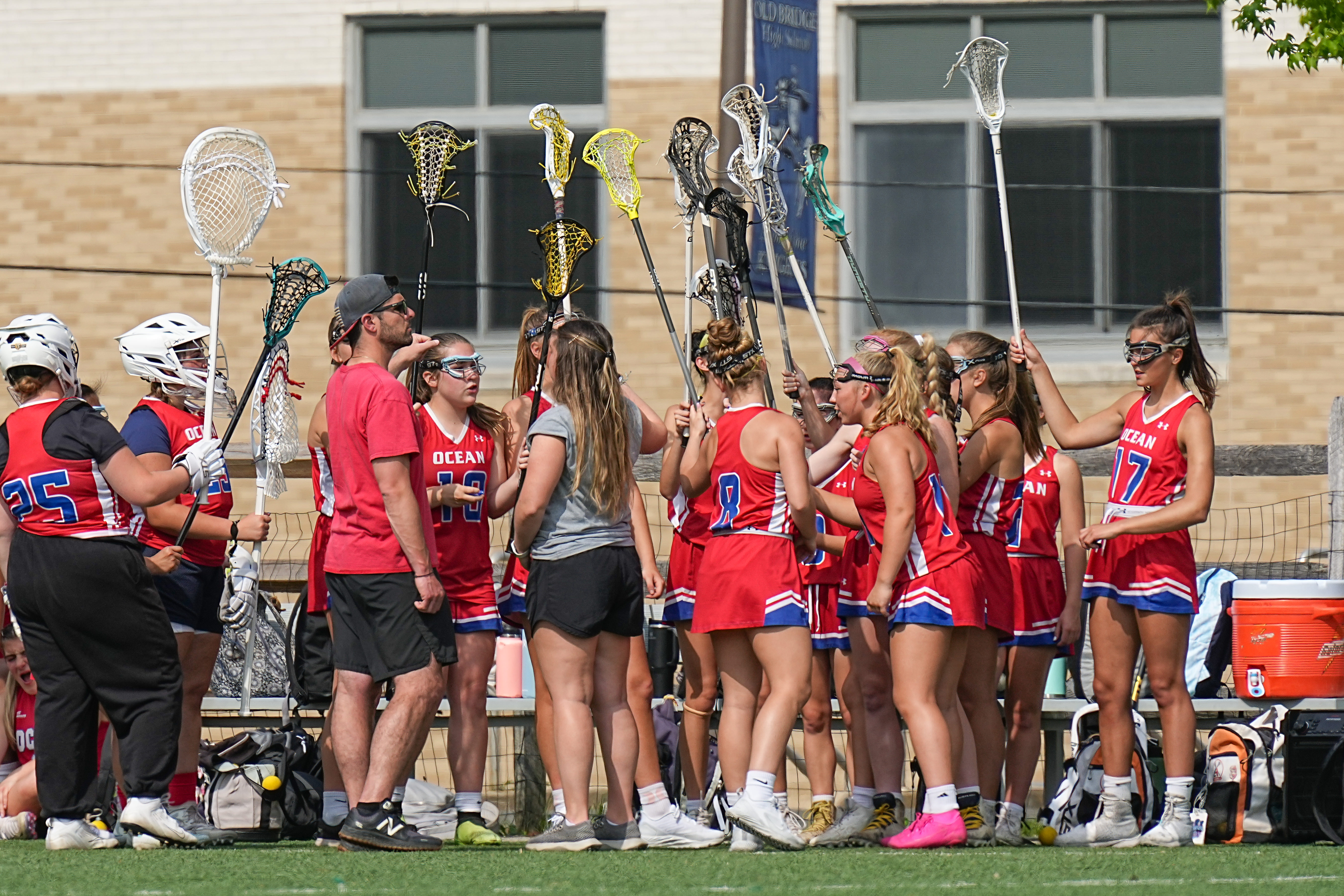 Ocean Township players huddle prior to the lacrosse game between Ocean Township and Old Bridge at Geick Park in Matawan, NJ on May 11, 2023.